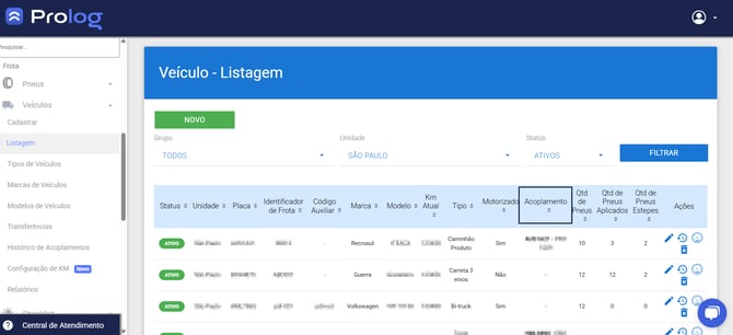 Para visualizar de maneira rápida os veículos que estão acoplados, acesse Veículos > Listagem e verifique a coluna Acoplamento:
