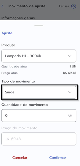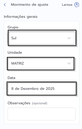 Em Movimento de ajustes é possível realizar entrada ou saída de produtos da unidade selecionada, dessa forma a quantidade disponível em estoque é atualizada.