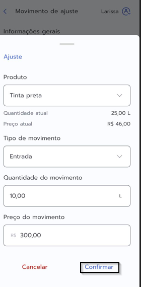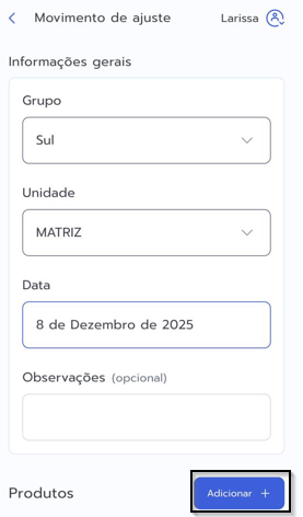 3. Para realizar o ajuste, clique em Add+ ,selecione o produto e o tipo de movimentação, informe o valor em caso de entrada e a quantidade a movimentar, confirme. Feito isso, clique em confirmar.