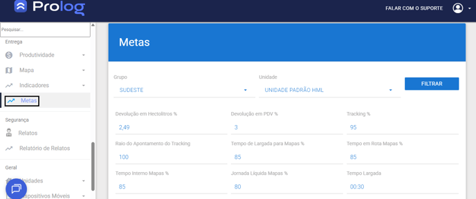 No campo Metas, é possível definir os índices de cada indicador e alterá-los conforme a necessidade de cada unidade, garantindo maior aderência à realidade operacional.