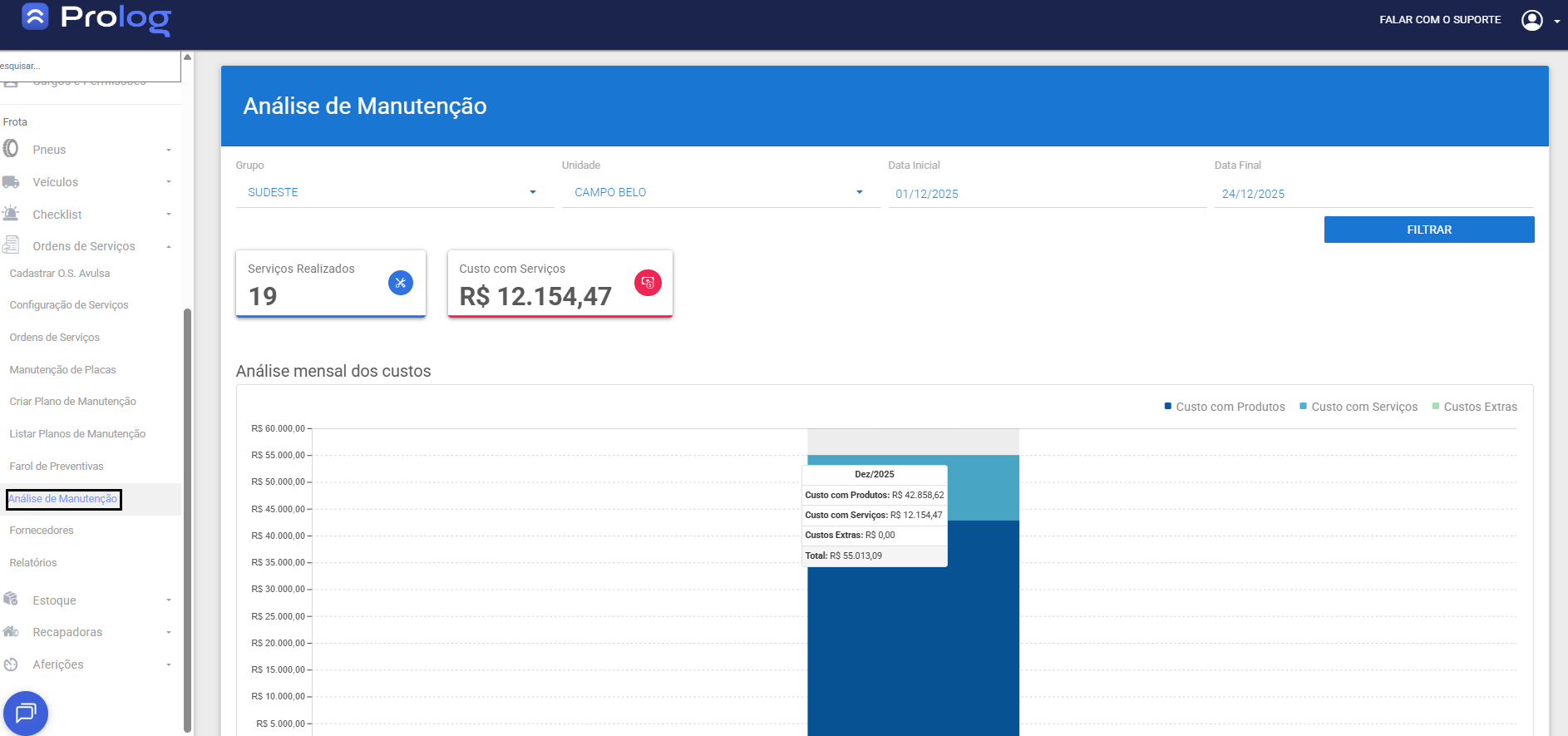 Este dashboard de Análise de Manutenção oferece uma visão geral clara e consolidada dos serviços executados e dos custos envolvidos em um determinado período, centralizando informações essenciais para a gestão da manutenção da frota.