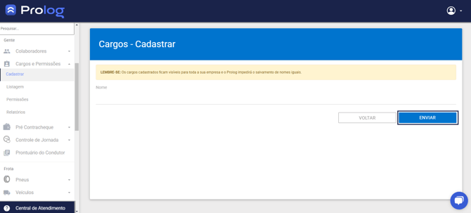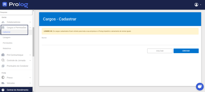 Os cargos cadastrados ficam visíveis para toda a sua empresa e o Prolog impedirá o salvamento de nomes iguais.