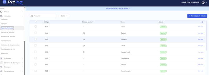 1 - No menu do PrologWeb, escolha a opção Veículos > Tipo de veículos.