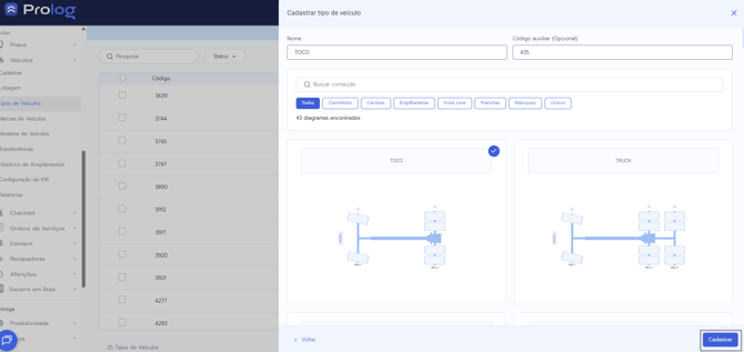 Através desta informação no cadastro de um novo veículo é atribuído à ele o seu respectivo diagrama esquemático de pneus, importante para os vínculos e movimentações posteriores realizados no sistema.
