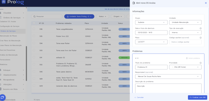 Agora é possível adicionar novos problemas diretamente em Ordens de Serviço já existentes, tanto no Web quanto no App. Com isso, é possível manter o registro das ocorrências sempre atualizado, garantindo um acompanhamento mais completo e preciso da manutenção.