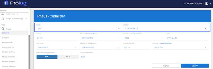 2. Na tela abaixo você selecionará o grupo e unidade, preencherá as informações de cadastro do pneu e clicará no botão enviar.