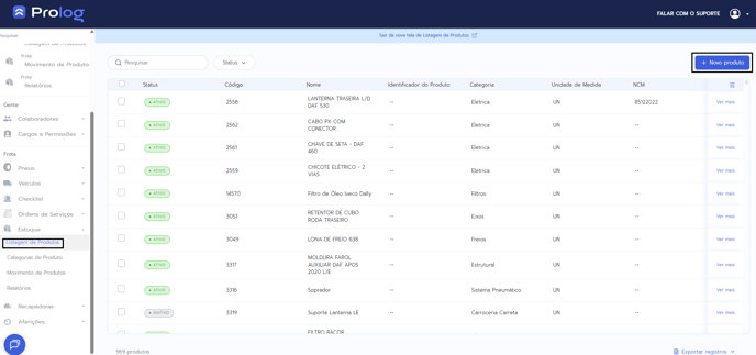 1. No menu do PrologWeb, escolha a opção Estoque > Listagem de Produtos > +Novo produto.