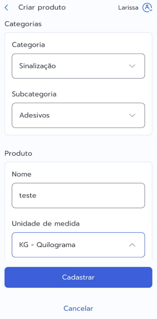 3. Preencha as informações necessárias e clique no botão Cadastrar para finalizar o processo de cadastramento de um novo produto no estoque.