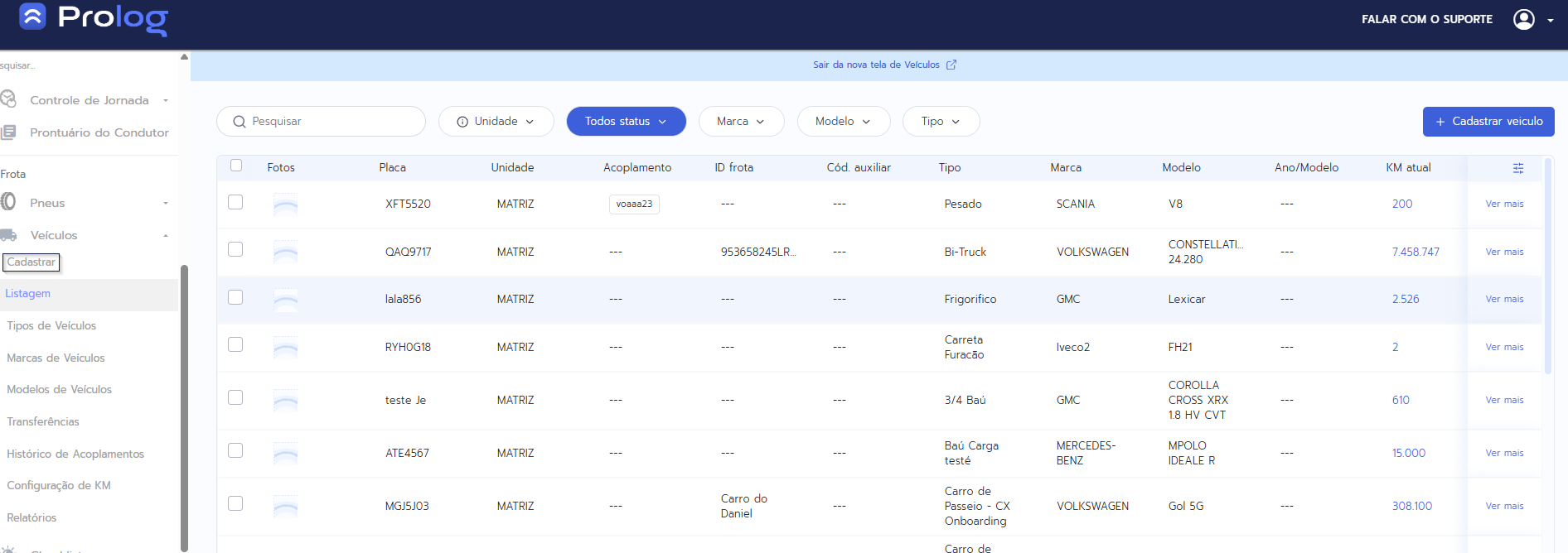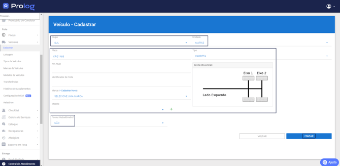 Observação: O cadastro de veículos está disponível tanto no Prolog Web quanto no Prolog App, com pequenas diferenças na interface, mas mesma lógica de preenchimento.