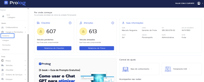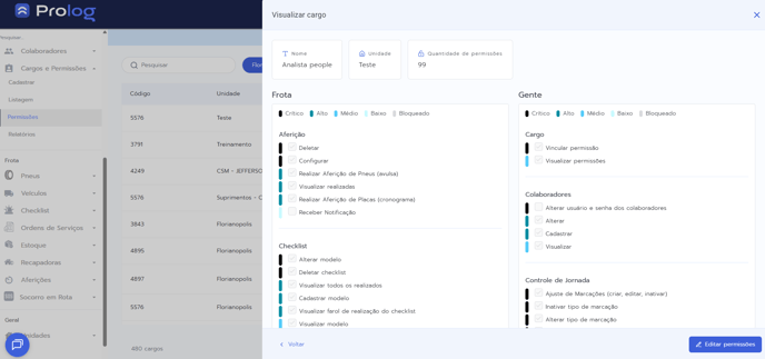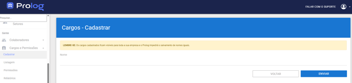 - No menu do Prolog Web, selecione: Cargos e Permissões > Cadastrar
