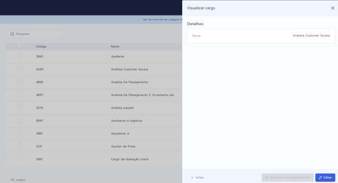 - Para editar um cargo existente, vá até a listagem e clique em Ver mais > Editar