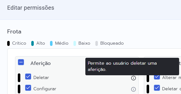 - Clique no ícone ao lado de cada funcionalidade para visualizar o impacto da permissão