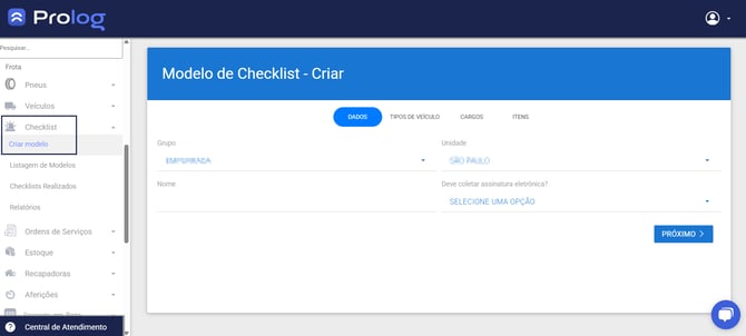 1 - No menu do PrologWeb, escolha a opção Checklist > Criar modelo 📋