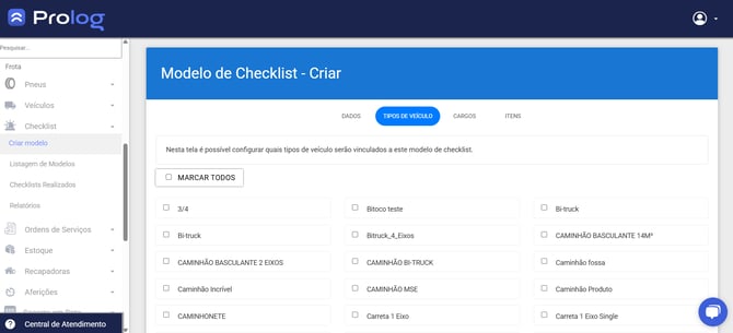 O modelo de checklist só irá aparecer para realização quando o tipo de veículo selecionado estiver marcado nesta tela.