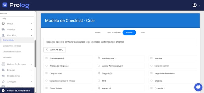 8 - Em Cargos, selecione, dentre os cargos cadastrados, para quais o checklist estará disponível para realização.