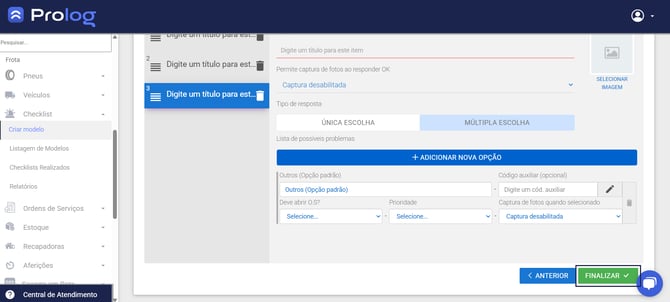 Atenção! A opção Outros sempre estará presente como opção de resposta para os itens, não sendo necessária a criação da mesma. Esta opção permite que o colaborador que está realizando o checklist relate um problema não oferecido entre as demais respostas. Ainda assim, as opções de "Deve abrir O.S?" e "Prioridade" devem ser configuradas para esta alternativa.