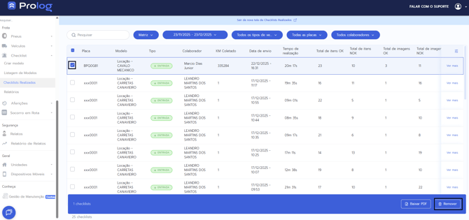 - Após selecionar o checklist, o botão "Remover" será habilitado na barra de ações superior.