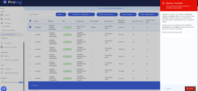 - Preencha o campo de justificativa com uma explicação clara do motivo da exclusão (ex.: "Checklist duplicado", "Dados inseridos incorretamente", "Veículo não realizou operação").