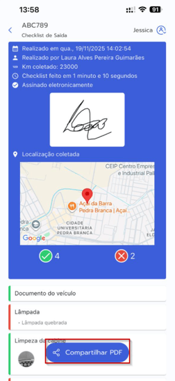 Acesse Checklists realizados → selecione o checklist desejado para ver os detalhes → clique no botão "Compartilhar PDF".