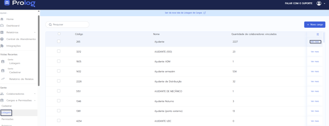 1. No menu do PrologWeb, escolha a opção de Cargos e Permissões > Listagem. A listagem com todos os cargos presentes na base de dados será apresentada.