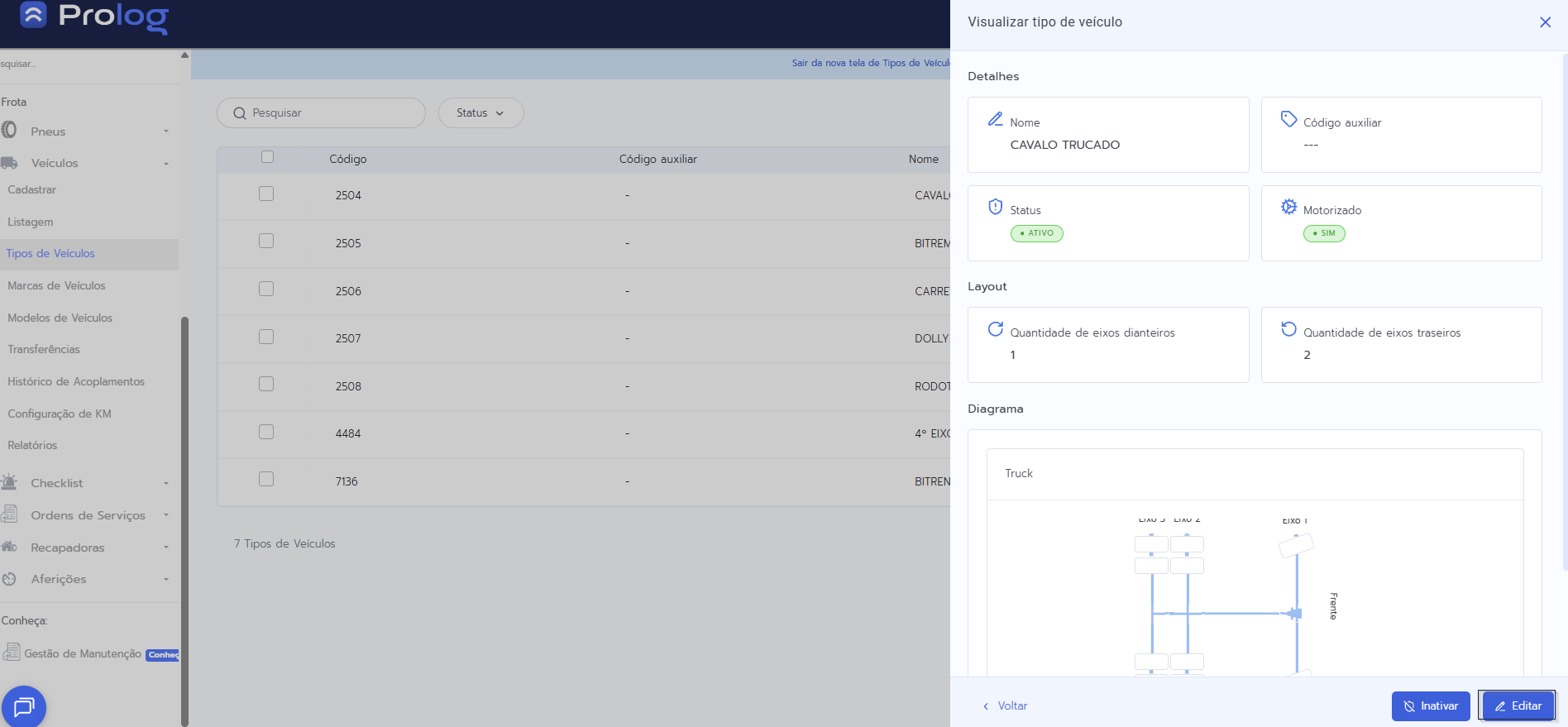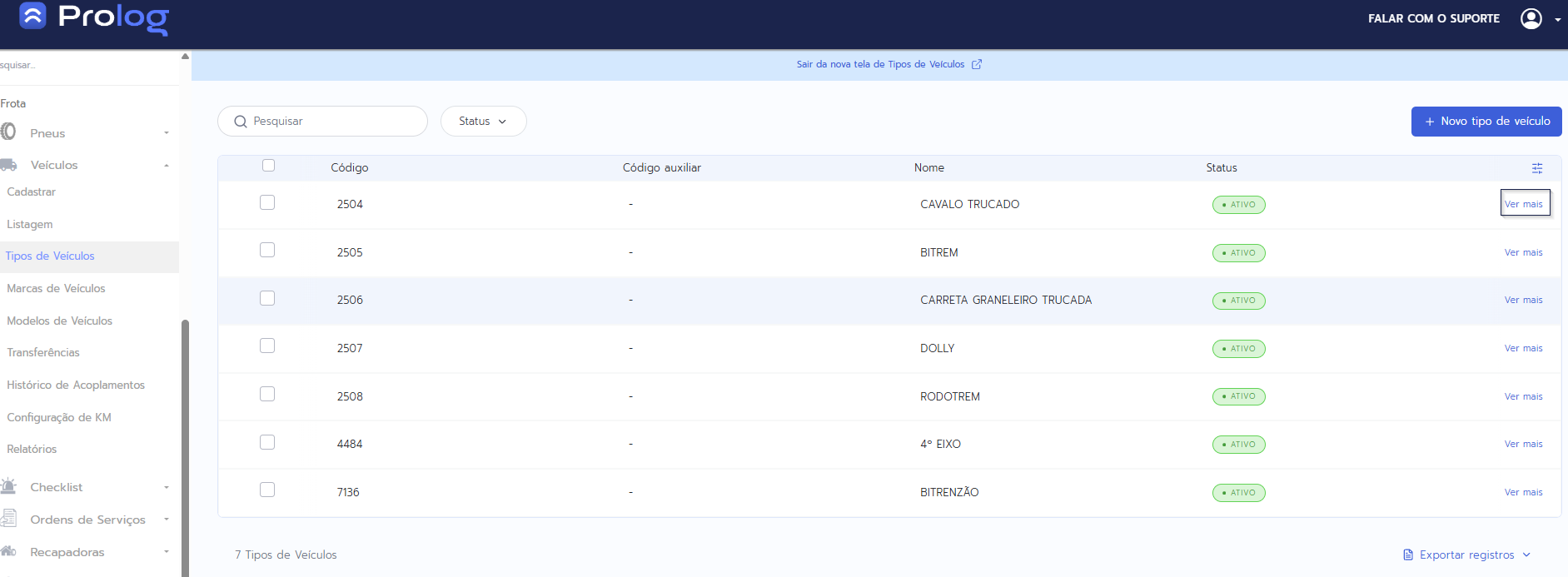 1 - No menu do PrologWeb, escolha a opção Veículos > Tipos de veículos.