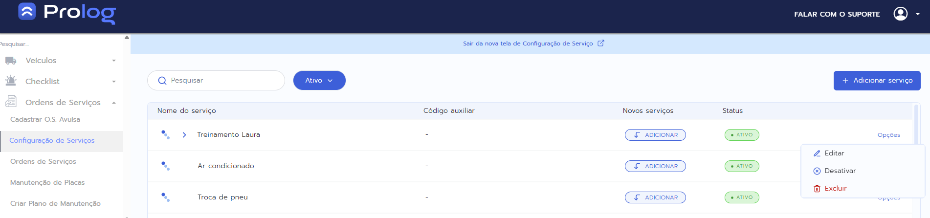 1. No menu do PrologWeb, escolha a opção Ordens de Serviços > Configurações de Serviços > procure o serviço que deseja alterar e clique em Opções, é possível Editar, Desativar ou Excluir.