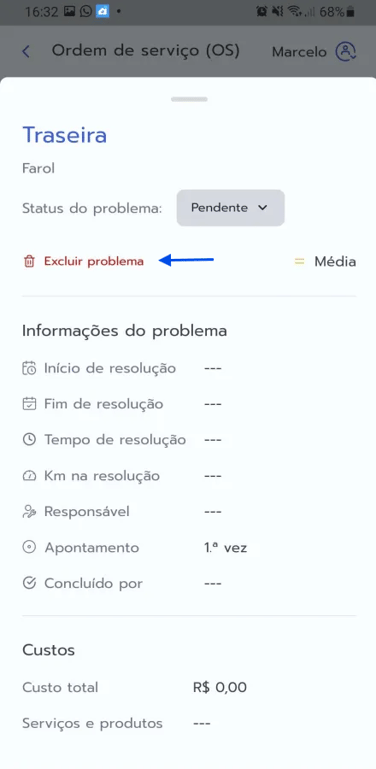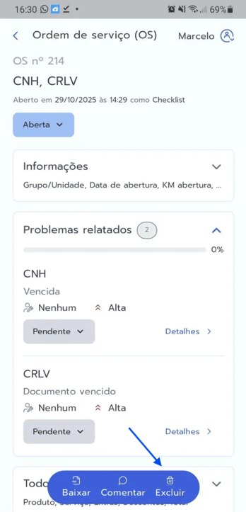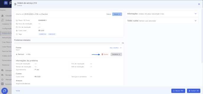 - Para excluir a ordem de serviço completa, após acessa-la, na parte inferior da tela, clique Excluir.