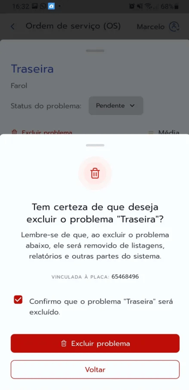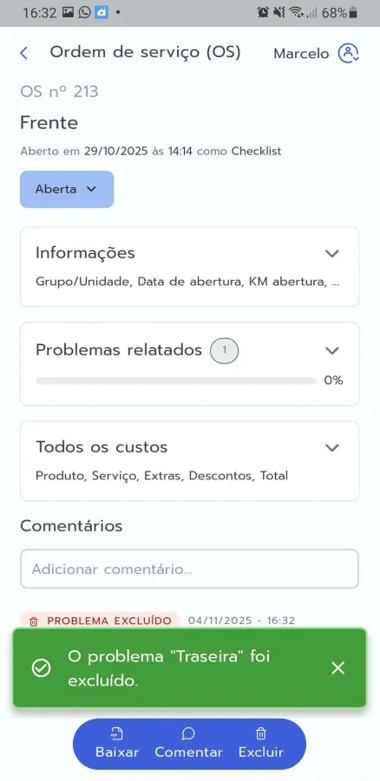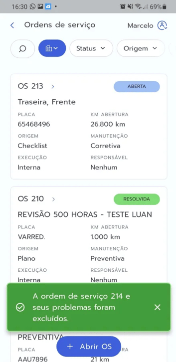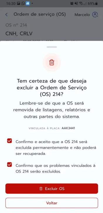 - Após concluir, uma notificação será exibida confirmando a exclusão da ordem de serviço ou do item específico.