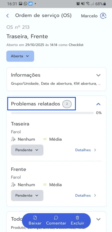 - Após acessar a ordem, clique em Problemas relatados para expandir os itens.