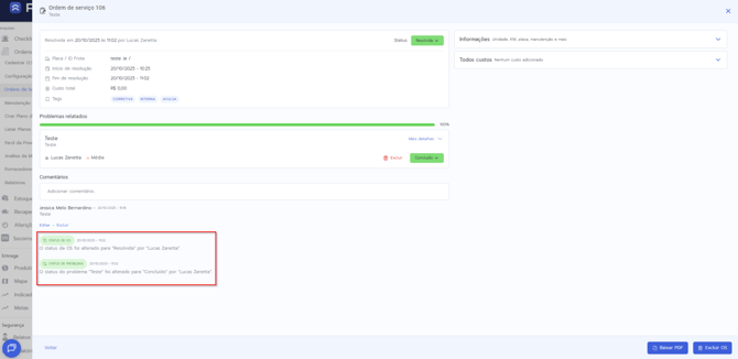 As ações de resolução de problemas, resolução de Ordens de Serviço e exclusão de problemas passam a ser destacadas com tags nos comentários, facilitando a identificação de quem realizou cada ação.