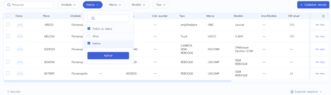 - Na tela de Listagem de Veículos, clique no filtro de status e selecione "Inativo".