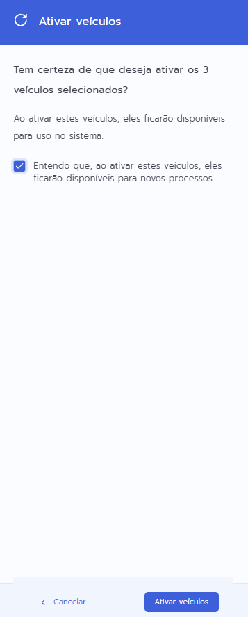 - Marque a opção de confirmação entendendo que o veículo ficará indisponível para novos processos.