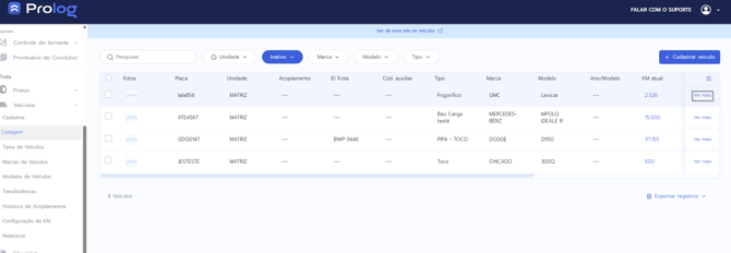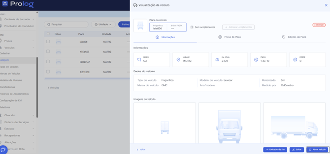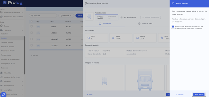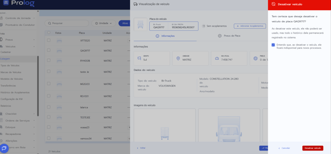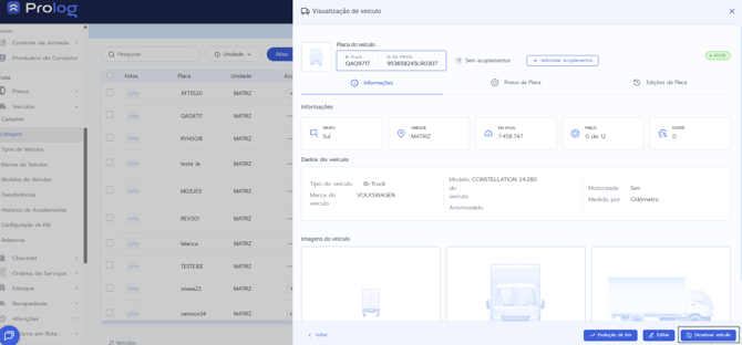 - Disponibilidade da funcionalidade: A opção de ativar/inativar veículos está disponível exclusivamente no Prolog Web. Não há versão equivalente no aplicativo mobile.