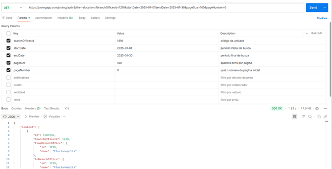 É possível realizar uma busca mais especifica pelos filtros destinations, vehicleId e tireId.