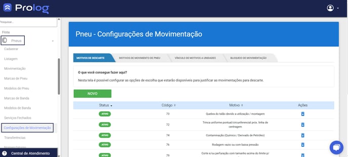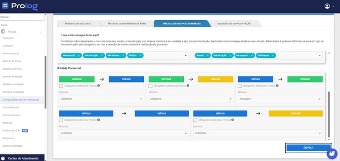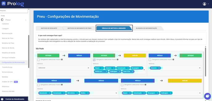 Este artigo orienta como configurar quais motivos de movimentação de pneus estarão disponíveis por unidade comercial e em quais tipos de movimentação (ex: estoque → veículo, veículo → análise, etc.) sua seleção será obrigatória ou opcional. A configuração é feita exclusivamente pelo Prolog Web.