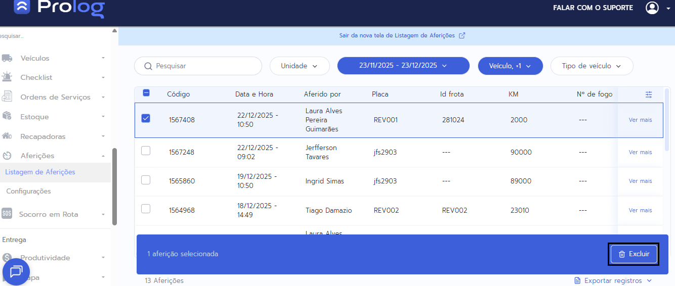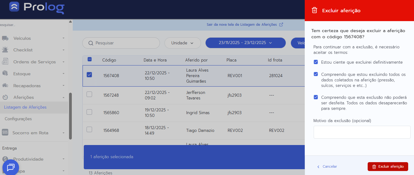 O processo de exclusão é definitivo e deletará toda a aferição do veículo, bem como todos os dados coletados nela (pressão, sulcos, serviços, etc..). É um processo que deve ser feito com muita cautela e atenção.