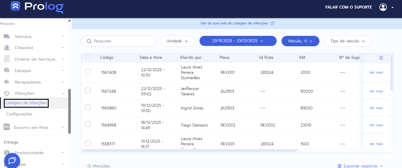 1. No menu do PrologWeb, escolha a opção Aferições > Listagem de Aferições. 💻