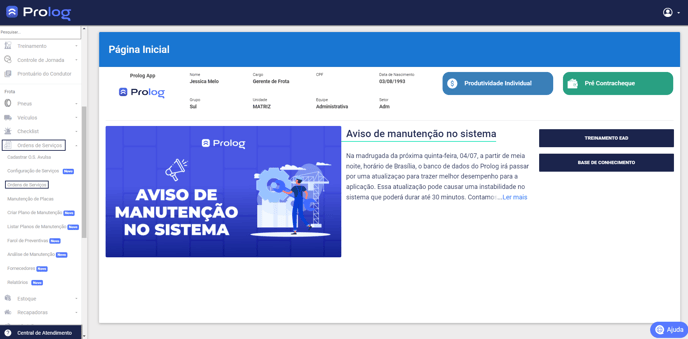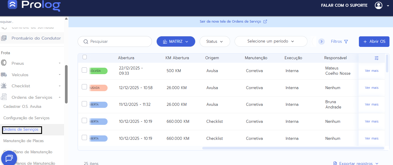 1. No menu do PrologWeb, escolha a opção Ordens de Serviços > Ordens de Serviços.