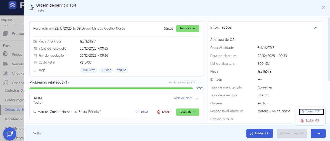Você terá a opção de baixar a ordem de serviço em formato PDF para poder imprimi-la. Essa flexibilidade não apenas atende às preferências individuais de documentação, mas também otimiza a eficiência operacional. A organização interna dos mecânicos e gestores será melhorada, assim como a capacidade de resposta e resolução de problemas por parte de terceiros envolvidos.