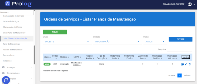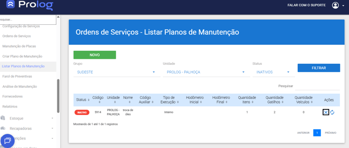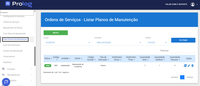 1. No menu do PrologWeb, escolha a opção Ordens de Serviços > Listar Plano de Manutenção > selecione o grupo e unidade que deseja visualizar e clique em Filtrar.