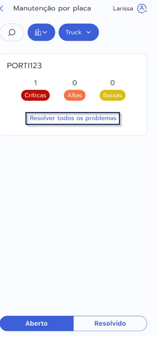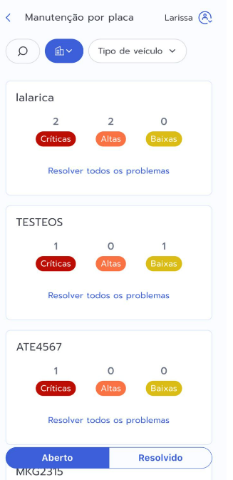 Na tela abaixo, você conseguirá visualizar quais placas estão com ordens de serviço pendentes ou resolvidas: