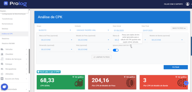 Agora é possível ignorar pneus sem quilometragem registrada na análise de CPK do Dashboard. Com esse novo filtro, a visualização dos dados se torna mais precisa e flexível, principalmente para operações que possuem pneus legados cadastrados sem histórico de rodagem.