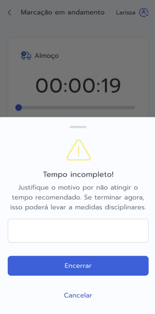 Caso o colaborador finalize o período de marcação antes ou depois do tempo pré determinado, a finalização da ação só ocorrerá mediante preenchimento de justificativa.