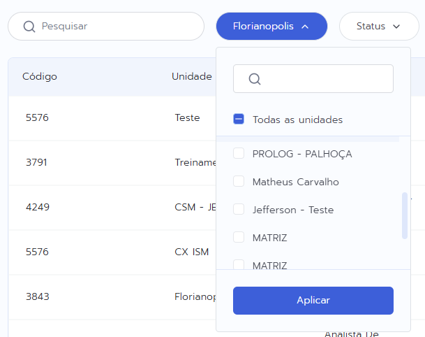 - Ao acessar a tela de Permissões, nos filtros defina para qual Unidade deseja aplicar as vinculações de permissão.