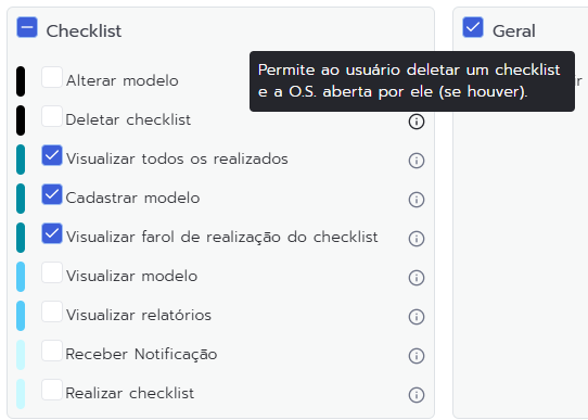 - Ao lado de cada item, há um ícone de exclamação. Passe o mouse sobre ele para visualizar a descrição detalhada da permissão.