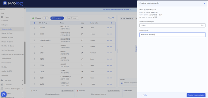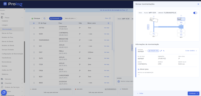 - Para cada pneu movimentado, é possível editar informações específicas (marca, modelo, medida, etc.) ou adicionar um motivo da movimentação geral.