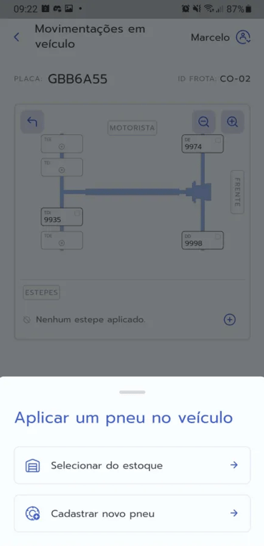 - "Selecionar do estoque" (para pneus já cadastrados)