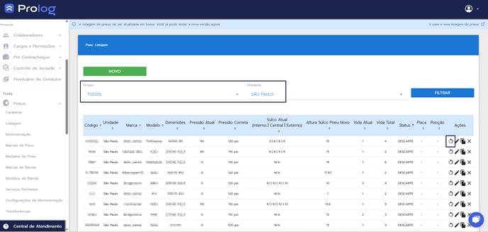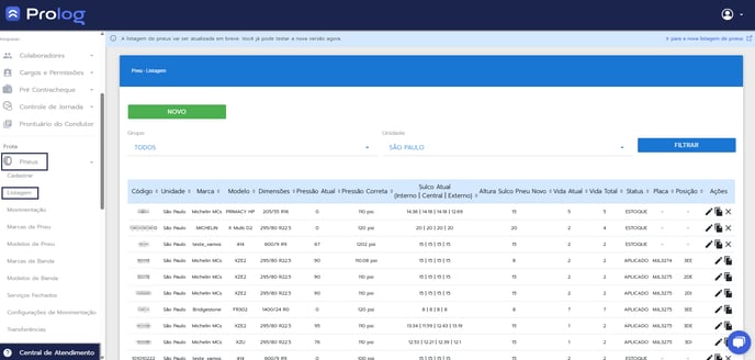 Se a opção “Pneus” ou “Listagem” não estiver visível, entre em contato com o seu gestor para verificar as permissões de acesso.