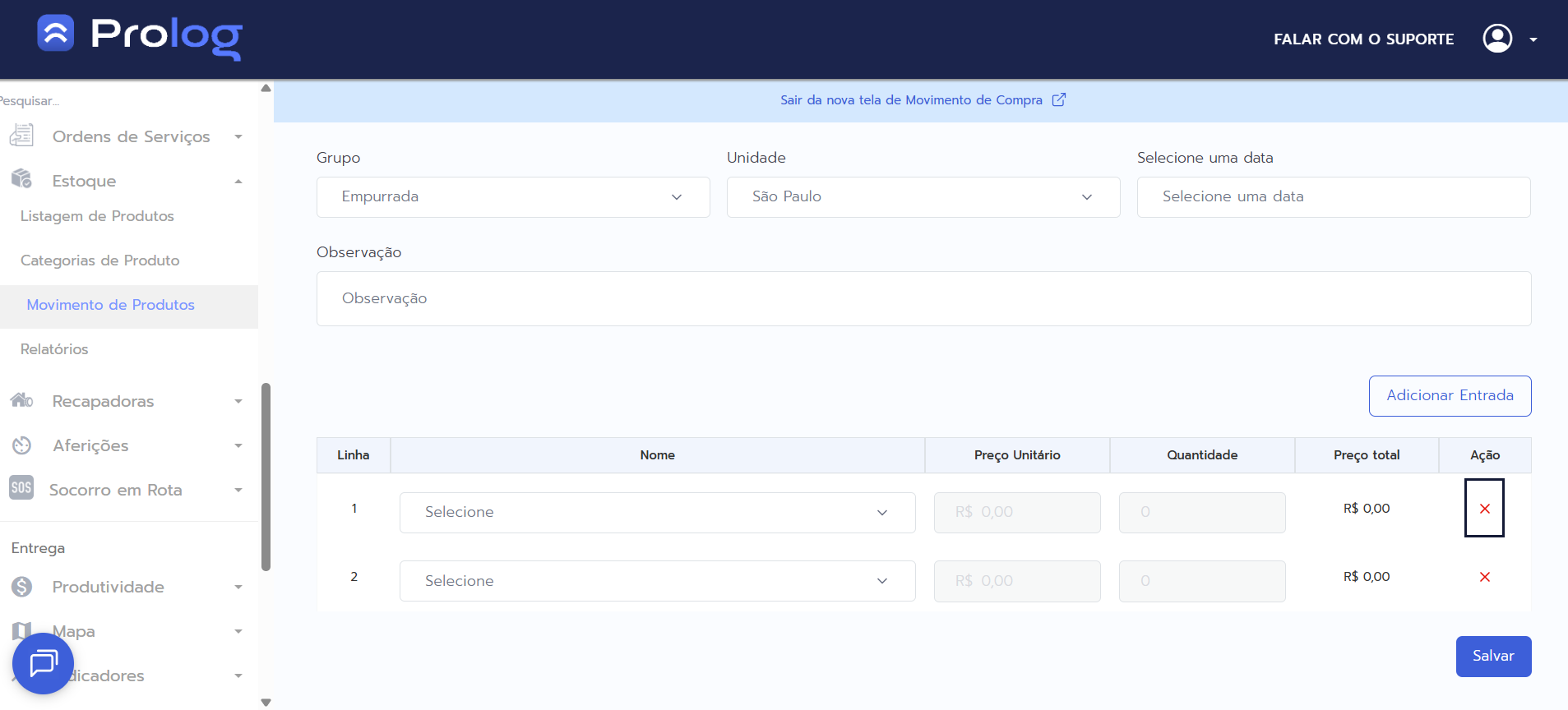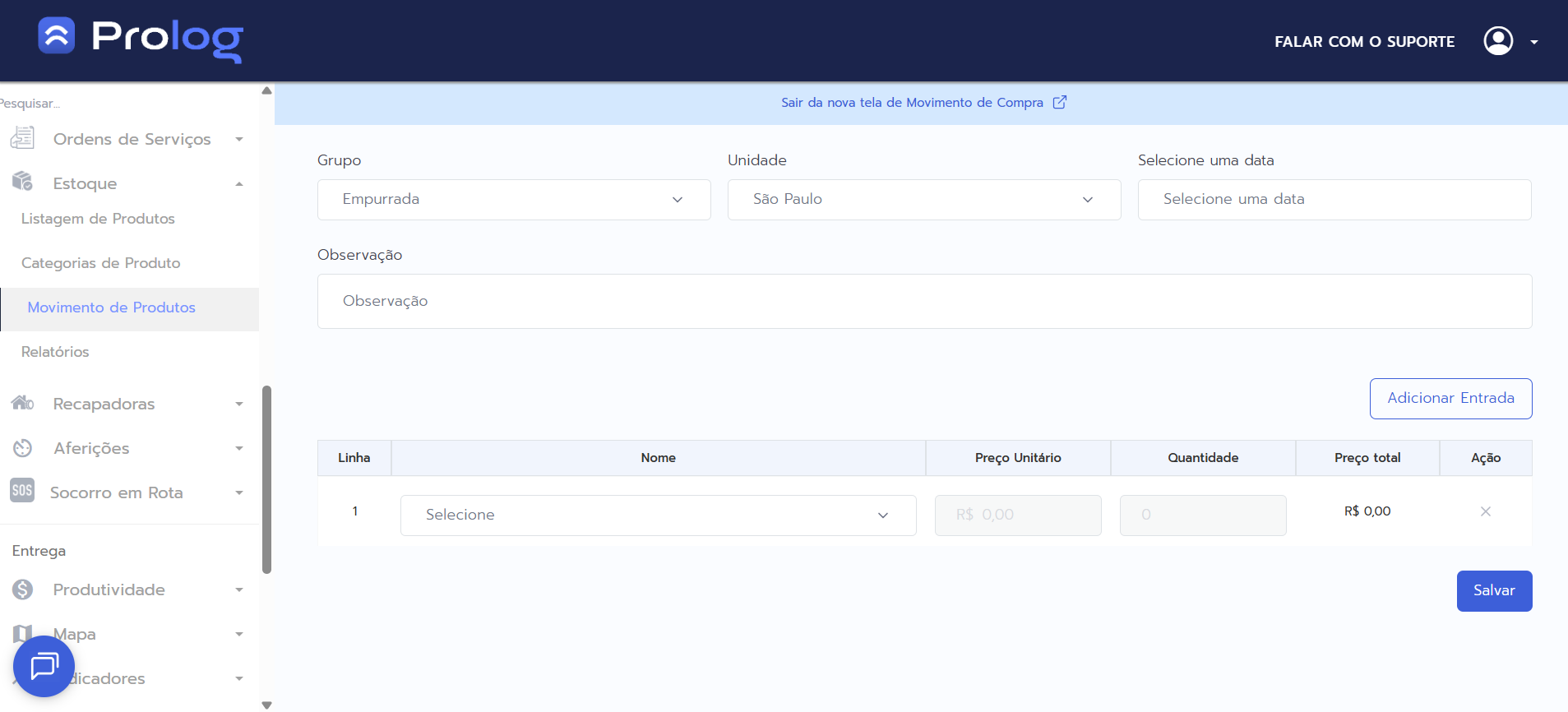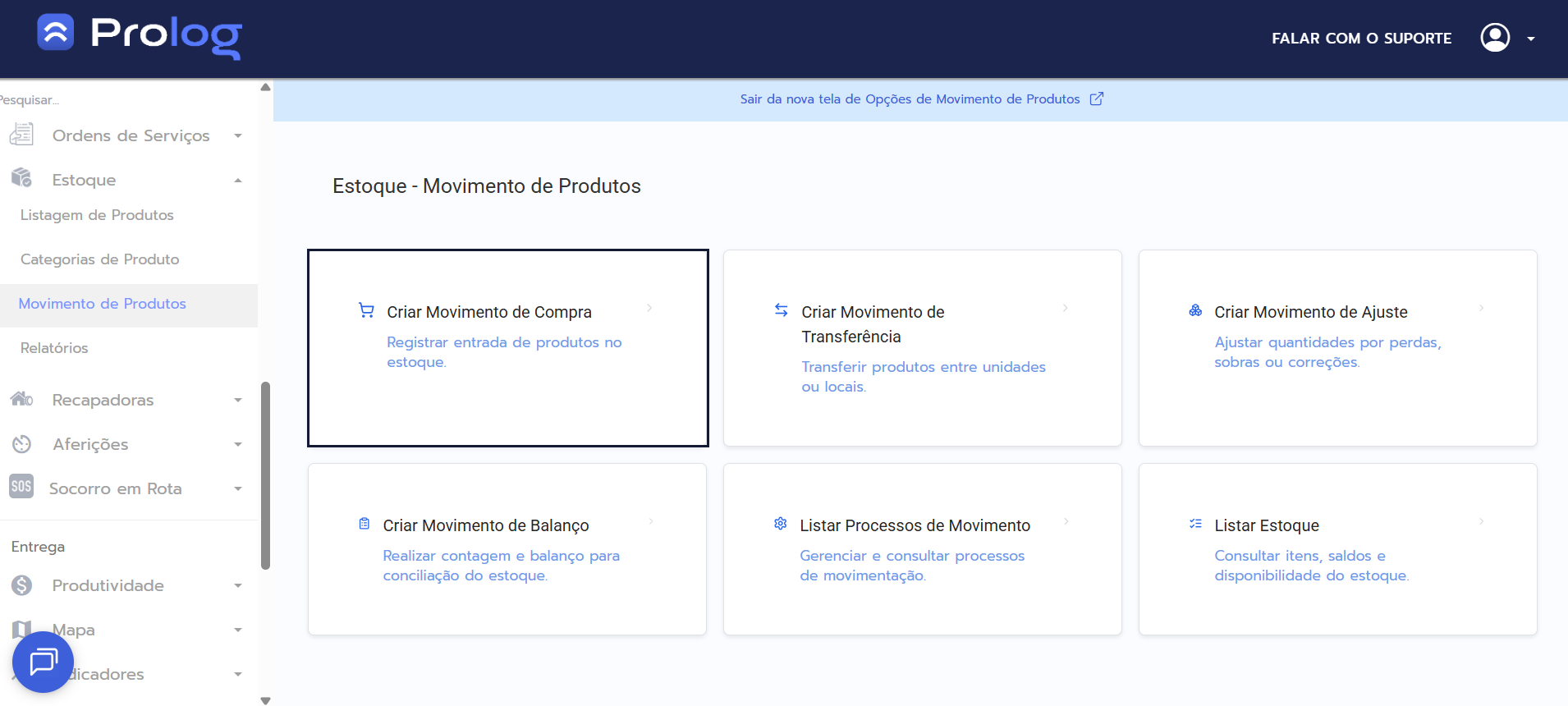 1. No menu do PrologWeb, escolha a opção Estoque > Movimento de Produtos > Criar Movimento de Compra.