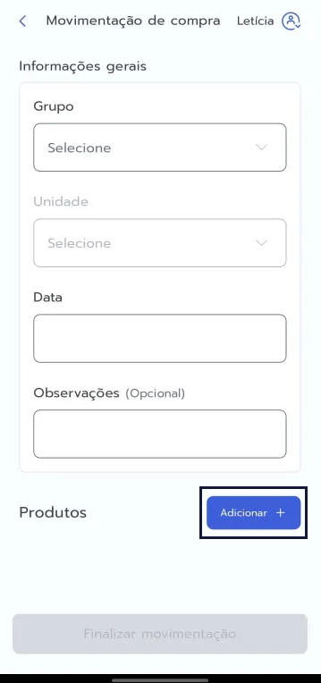 4. Caso seja necessário adicionar mais itens, clique em Adicionar. Para concluir a compra, clique em Finalizar movimentação.